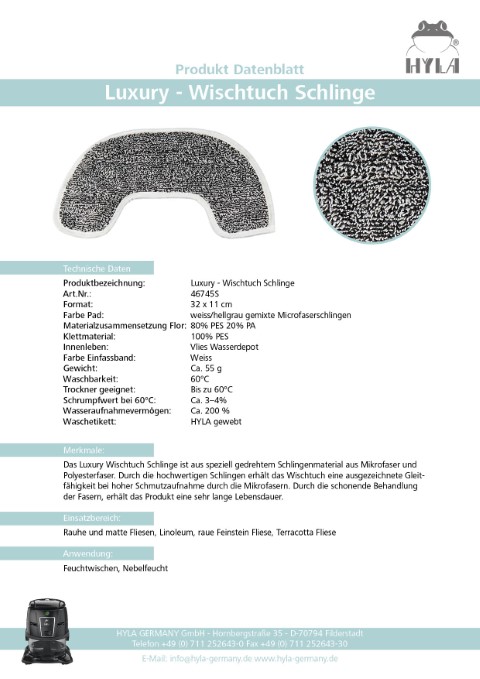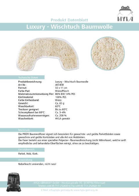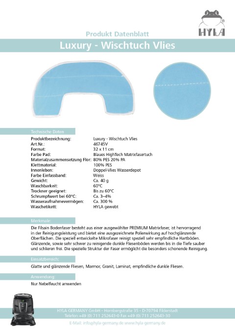 Sie wird mit drei hochwertigen Wischtüchern geliefert (Baumwolle, Schlinge, Vlies) die eine ausgezeichnete Reinigungsleistung bieten und eine polierende Wirkung haben. Durch die unterschiedlichen Arten von Tüchern können alle Arten von Böden problemlos gereinigt werden. Die Halterung ist kompatibel mit dem Nimbus Nassreinigungssystem und kann einfach montiert werden, indem sie auf die Umschaltbare Bodendüse geklippt wird.